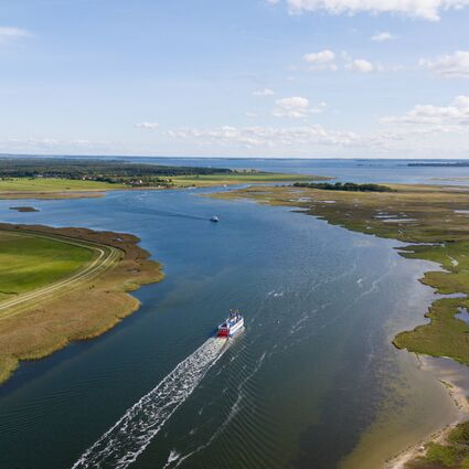 Auf der anderen Seite der Halbinsel zeigt sich die Boddenküste von ihrer charmanten Seite, eingebettet in ein grünes Küstenvorland mit weitläufigen Wiesen, Mooren und Wäldern. Diese harmonische Landschaft lädt zu Entdeckungstouren und entspannten Momenten inmitten der Natur ein.
